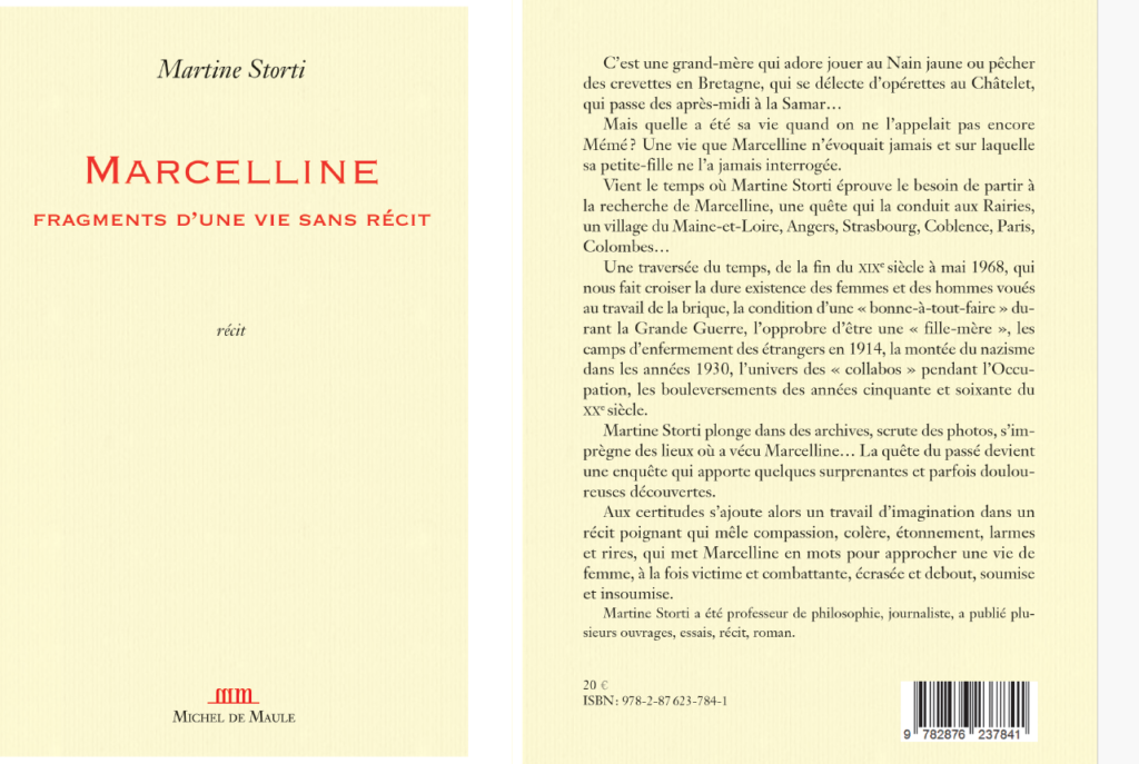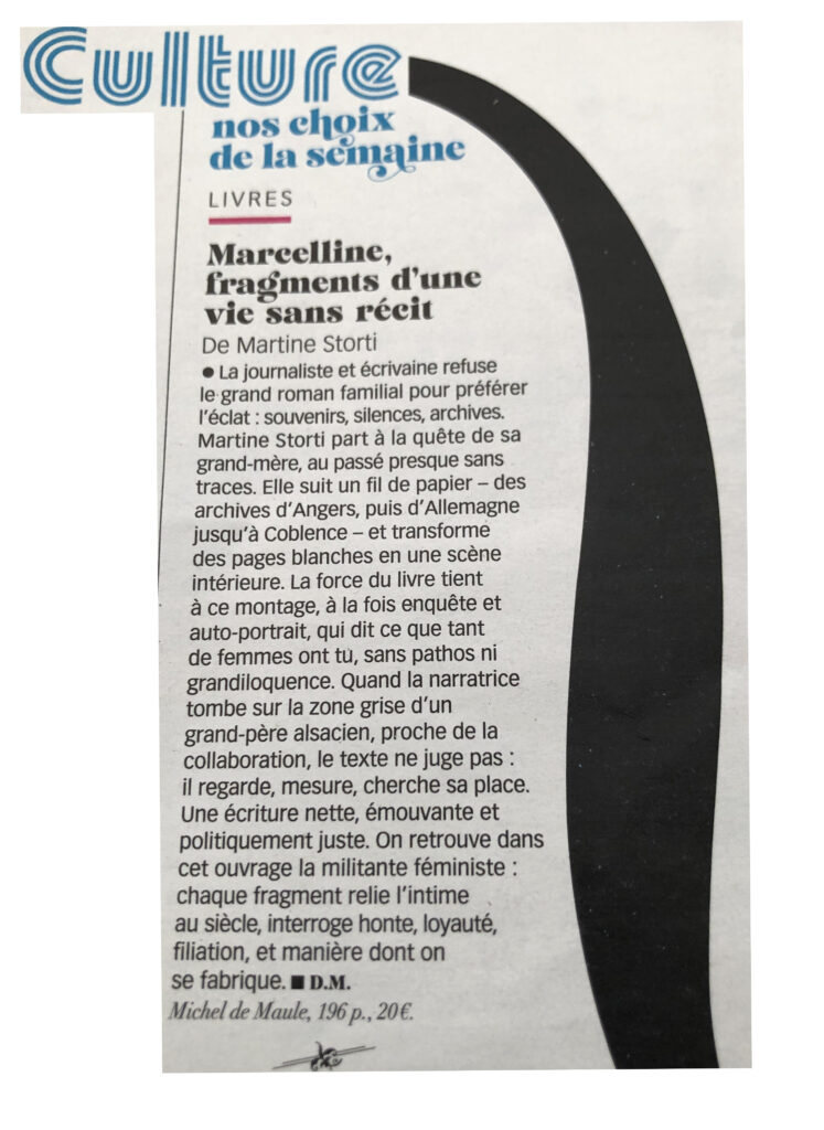 Mettre Marcelline par écrit, écrire Marcelline, la retrouver ou plutôt la découvrir dans sa singularité. Et la faire découvrir à d’autres. Accomplir un geste de transmission.
